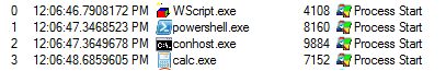 Ein in JScript oder VBScript geschriebenes Skript, das PowerShell aufruft und die Standard-Rechneranwendung von Windows startet, erzeugt beispielsweise den in der folgenden Abbildung gezeigten Prozessablauf. Der Skriptinterpreter WScript.exe ist dabei der Elternprozess für PowerShell, das wiederum der Elternprozess für conhost.exe ist, welches schließlich die Rechenanwendung calc.exe startet [9].